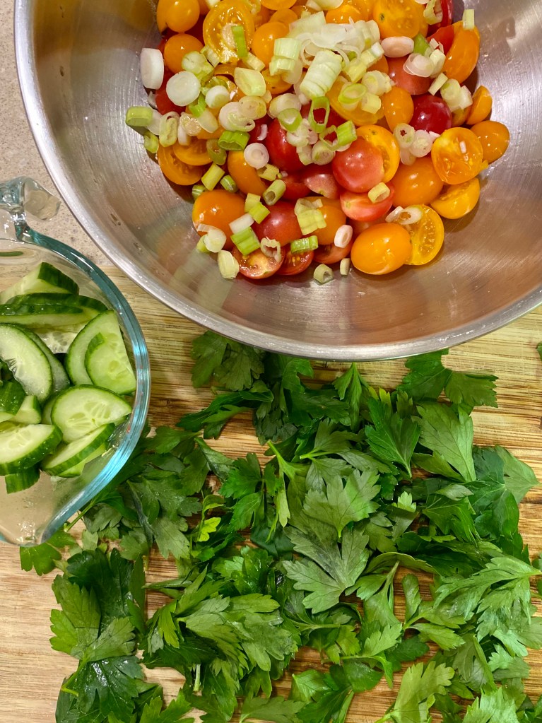 so, anyway… this cooking week is off to a good start. we almost did get takeout after the beach though, but decided not to carry out (pun intended … sorry)! i have way too much produce that needs to be cooked to justify eating out, and i’m pleased that i’m now more prepared for the rest of the week: leftover rice, soon-to-be bread, baked tempeh, leftover parsley and brown rice salad! yay!